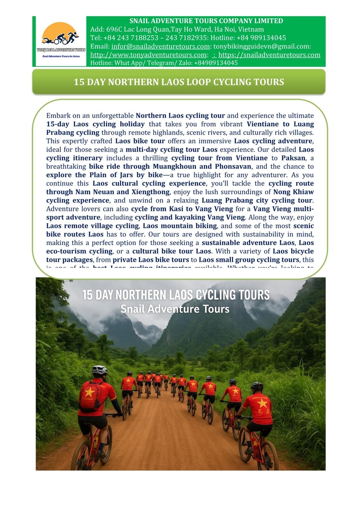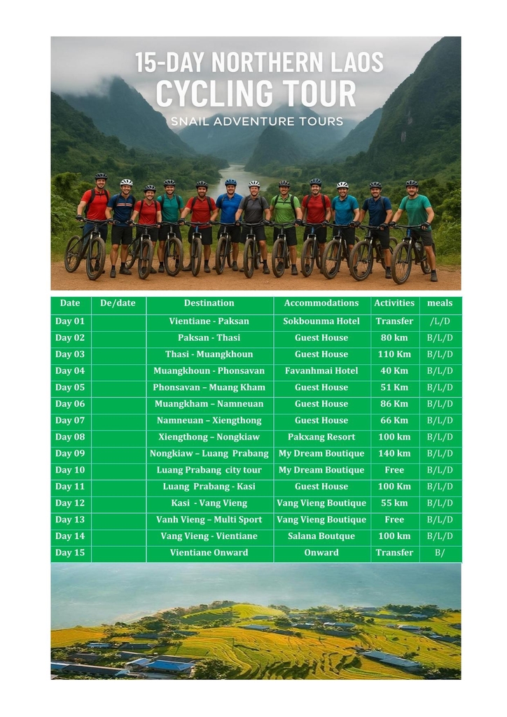 Embark on an unforgettable Northern Laos cycling tour and experience the ultimate 15-day Laos cycling holiday that takes you from vibrant Vientiane to Luang Prabang cycling through remote highlands, scenic rivers, and culturally rich villages. This expertly crafted Laos bike tour offers an immersive Laos cycling adventure, ideal for those seeking a multi-day cycling tour Laos experience. Our detailed Laos cycling itinerary includes a thrilling cycling tour from Vientiane to Paksan, a breathtaking bike ride through Muangkhoun and Phonsavan, and the chance to explore the Plain of Jars by bike—a true highlight for any adventurer. As you continue this Laos cultural cycling experience, you'll tackle the cycling route through Nam Neuan and Xiengthong, enjoy the lush surroundings of Nong Khiaw cycling experience, and unwind on a relaxing Luang Prabang city cycling tour. Adventure lovers can also cycle from Kasi to Vang Vieng for a Vang Vieng multi-sport adventure, including cycling and kayaking Vang Vieng. Along the way, enjoy Laos remote village cycling, Laos mountain biking, and some of the most scenic bike routes Laos has to offer. Our tours are designed with sustainability in mind, making this a perfect option for those seeking a sustainable adventure Laos, Laos eco-tourism cycling, or a cultural bike tour Laos. With a variety of Laos bicycle tour packages, from private Laos bike tours to Laos small group cycling tours, this is one of the best Laos cycling itineraries available. Whether you’re looking to explore Laos by bike, discover Laos off-the-beaten-path tours, or simply enjoy an active holiday Laos, now is the time to book Laos cycling tour with our experienced team. Choose from custom Laos cycling trips, affordable Laos cycling tours, or our exclusive Laos cycling tour packages 2025 to suit your adventure needs. Let our professional guides lead your journey on one of the finest Laos guided bike tours through this magical and unspoiled part of Southeast Asia.