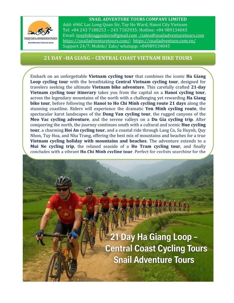 Embark on an unforgettable Vietnam cycling tour that combines the iconic Ha Giang Loop cycling tour with the breathtaking Central Vietnam cycling tour, designed for travelers seeking the ultimate Vietnam bike adventure. This carefully crafted 21-day Vietnam cycling tour itinerary takes you from the capital on a Hanoi cycling tour, across the legendary mountains of the north with a challenging yet rewarding Ha Giang bike tour, before following the Hanoi to Ho Chi Minh cycling route 21 days along the stunning coastline. Riders will experience the dramatic Yen Minh cycling route, the spectacular karst landscapes of the Dong Van cycling tour, the rugged canyons of the Meo Vac cycling adventure, and the serene valleys on a Du Gia cycling trip. After conquering the north, the journey continues south with a cultural and scenic Hue cycling tour, a charming Hoi An cycling tour, and a coastal ride through Lang Co, Sa Huynh, Quy Nhon, Tuy Hoa, and Nha Trang, offering the best mix of mountains and beaches for a true Vietnam cycling holiday with mountains and beaches. The adventure extends to a Mui Ne cycling trip, the relaxed seaside of a Ho Tram cycling tour, and finally concludes with a vibrant Ho Chi Minh cycling tour. Perfect for cyclists searching for the best cycling tour Vietnam 3 weeks, this route blends rugged highlands with sandy shores, making it one of the most diverse multi-day Vietnam cycling tours. With expert guides leading guided cycling tours Vietnam, this program is ideal for those who crave cultural and adventure cycling tours Vietnam, an eco-friendly cycling tour Vietnam, or an off-the-beaten-path Vietnam cycling trip. From pedaling remote villages to cruising golden beaches, this multi-region Vietnam cycling holiday (north & central coast) delivers the perfect balance of discovery and challenge, a truly authentic Vietnam cycling and cultural experience tour for anyone ready for a long-distance Vietnam cycling adventure.