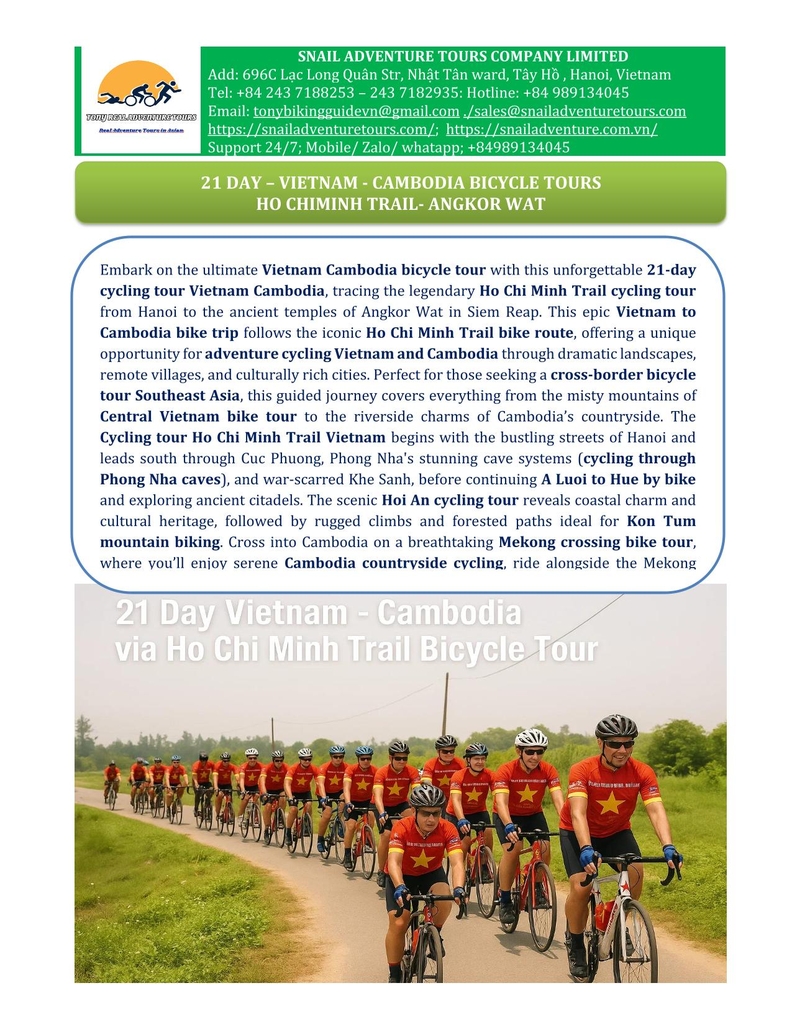 Embark on the ultimate Vietnam Cambodia cycling tour, a breathtaking Hanoi to Siem Reap bike tour that follows the legendary Ho Chi Minh Trail cycling tour route, offering an unforgettable Indochina cycling adventure. This cross-border Vietnam Cambodia bicycle tour takes you through lush mountains, tranquil villages, and historic landmarks on an epic Hanoi to Angkor Wat cycling trip. Perfect for those seeking a multi-country Southeast Asia cycling tour, this long-distance cycling Vietnam Cambodia itinerary is designed for passionate riders wanting a once-in-a-lifetime Vietnam to Cambodia cycle holiday. Whether you choose our fully supported Hanoi to Siem Reap cycling package or join as part of our small group cycling holidays Vietnam and Cambodia, you’ll enjoy a seamless bike tour from Hanoi to Siem Reap filled with cultural encounters and scenic backroads. This is adventure cycling Vietnam Cambodia at its best — a true Vietnam Cambodia cross-border biking expedition that doubles as a historical journey along the Ho Chi Minh Trail bike expedition route. Explore heritage towns and rural communities on a cultural cycling tour Southeast Asia, pedal through the heart of the Mekong on a Hanoi to Cambodia overland cycling trip, and soak in riverside life on a Mekong region cycling adventure. Discover the best cycling route Vietnam to Cambodia with our expert guides on these guided cycling tours Indochina, cycling from Hanoi via Ho Chi Minh Trail to Cambodia, conquering the stunning Phong Nha to Hue cycling route, enjoying the charming Hoi An to Kon Tum bike ride, and crossing into Cambodia for the adventurous Ban Lung to Strung Treng cycling trip. Continue along the Mekong on a Kratie to Kampong Cham bike tour, experience the beauty of cycling from Vietnam Central Highlands to Cambodia, and complete your adventure bike tour to Angkor Temples with a well-deserved rest day in Siem Reap. Whether it’s a Siem Reap cycling holiday from Hanoi, a Hanoi to Siem Reap guided bike tour, or a tailored Ho Chi Minh Trail and Angkor Wat cycling itinerary, this journey promises incredible scenery, rich culture, and an adventure you’ll never forget.