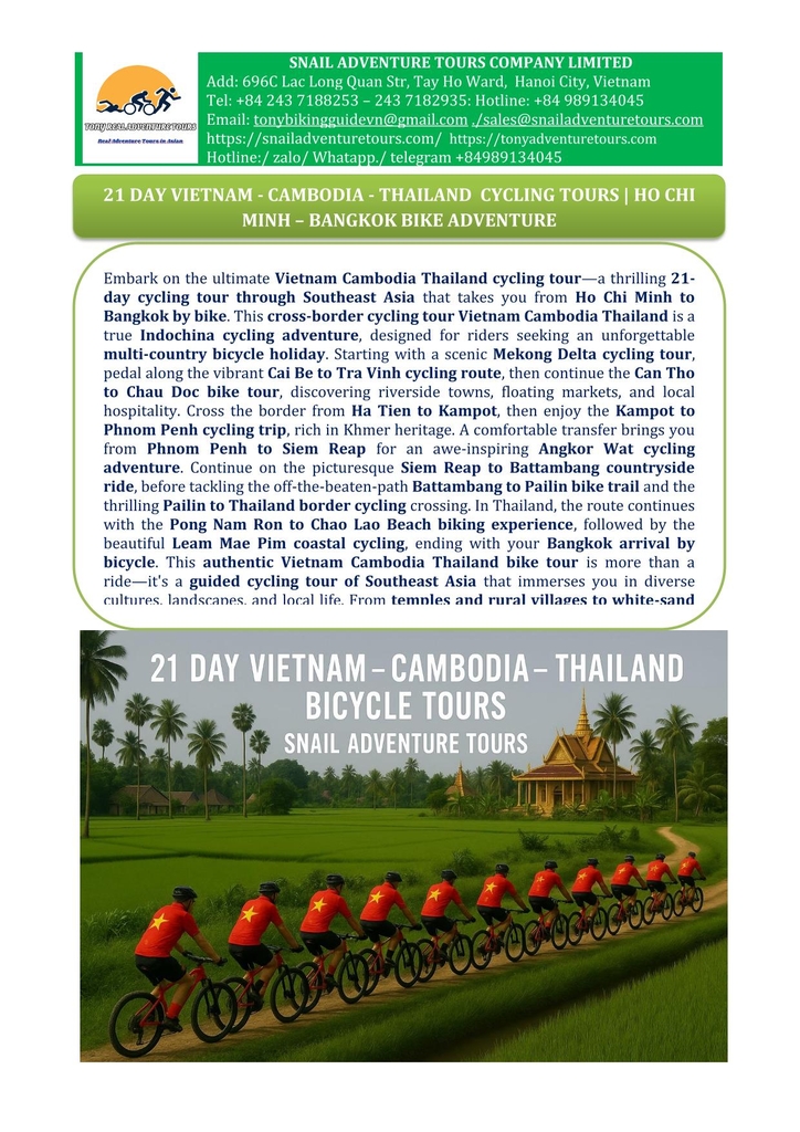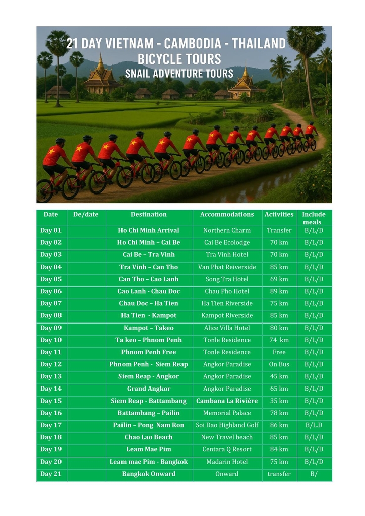 Embark on the ultimate Vietnam Cambodia Thailand cycling tour—a thrilling 21-day cycling tour through Southeast Asia that takes you from Ho Chi Minh to Bangkok by bike. This cross-border cycling tour Vietnam Cambodia Thailand is a true Indochina cycling adventure, designed for riders seeking an unforgettable multi-country bicycle holiday. Starting with a scenic Mekong Delta cycling tour, pedal along the vibrant Cai Be to Tra Vinh cycling route, then continue the Can Tho to Chau Doc bike tour, discovering riverside towns, floating markets, and local hospitality. Cross the border from Ha Tien to Kampot, then enjoy the Kampot to Phnom Penh cycling trip, rich in Khmer heritage. A comfortable transfer brings you from Phnom Penh to Siem Reap for an awe-inspiring Angkor Wat cycling adventure. Continue on the picturesque Siem Reap to Battambang countryside ride, before tackling the off-the-beaten-path Battambang to Pailin bike trail and the thrilling Pailin to Thailand border cycling crossing. In Thailand, the route continues with the Pong Nam Ron to Chao Lao Beach biking experience, followed by the beautiful Leam Mae Pim coastal cycling, ending with your Bangkok arrival by bicycle. This authentic Vietnam Cambodia Thailand bike tour is more than a ride—it's a guided cycling tour of Southeast Asia that immerses you in diverse cultures, landscapes, and local life. From temples and rural villages to white-sand beaches, this cycling holiday through Indochina offers the best of active travel Southeast Asia. Whether you're searching for the best Vietnam Cambodia Thailand cycling tour, looking to bike from Ho Chi Minh to Bangkok, or dreaming of a 3-country cycling adventure, this is the Southeast Asia bike tour you've been waiting for.